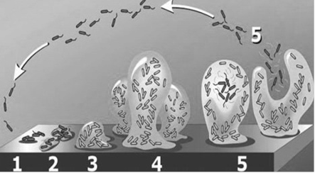 Межклеточная коммуникация посредством ауторегуляторов чрезвычайно важна для развития и функционирования биопленок. Известен ряд прмеров, когда при истощении источника питания в среде бактерии биопленки выделяют гидролитические ферменты, позволяющие им использовать полимеры матрикса как источники питания и одновременно высвобождающие их в виде планктонных клеток, способных найти более благоприятные для размножения условия. Показано, что выделение сурфактанта рамнолипида P. aeruginosa необходимо для предотвращения плотного прикрепления вновь образованных бактерий внутри биопленки и их удалениея из нее, и таким образом, формирования и поддержания полостей в биопленках рис. 1.
